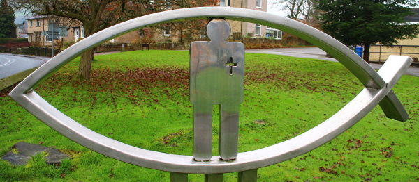 The pupil of the eye is represented by the figure of a person. The cross which is at the heart of the person is hollow and so allows light to shine through it and typifies God's love shining through his people to the community in which they both live and worship.